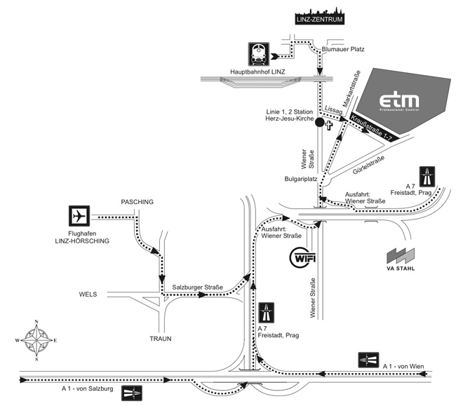 Take the A1 in the direction of Linz. Take the Linz exit onto the A7 heading for Prag/Freistadt. Take the "Wiener Straße" exit