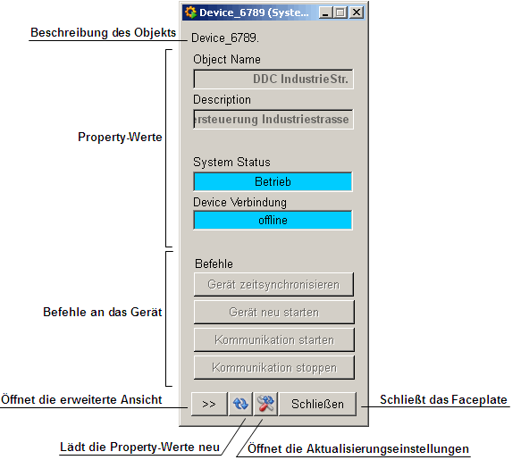 Da der Aufbau eines Faceplates je nach Objekttyp unterschiedlich sein kann, werden im Folgenden nur die Elemente eines Faceplates beschrieben, die in jedem Faceplate enthalten sind. Der Aufbau eines Faceplates eines bestimmten Objekttyps ist im entsprechenden Kapitel zum Objekttyp ersichtlich (siehe Übersichtstabellen der BACnet Objekttypen).