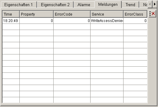 Die Registerkarte "Meldungen" beinhaltet Fehlermeldungen, die vom BACnet Treiber bzw. vom Controller seit dem Öffnen des Faceplates generiert wurden. Dadurch sind hier nur Meldungen sichtbar, die durch Benutzeraktionen in dem Faceplate ausgelöst wurden. Jedes Mal wenn das Faceplate neu geöffnet wird, werden somit die Meldungen für den Benutzer zurückgesetzt.