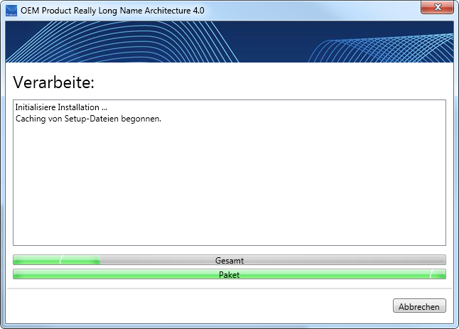 Das geänderte Setup finden Sie im Branding-Verzeichnis/Output. Öffnen Sie die .exe-Datei. Um die exe-Datei in deutscher Sprache zu öffnen, verwenden Sie die Kommandozeilenoption [Produktname.exe] /lang 1031 im Output-Verzeichnis - z.B. OEM_4_0.exe /lang 1031. Der Installationsassistent wird geöffnet.