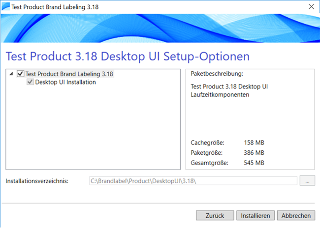 Ändern Sie den Namen des Desktop UIs indem Sie den Wert der Variablen DesktopUIName ändern sowie das Installationsverzeichnis indem Sie den Wert der Variable DesktopUIDir in der ProductConfiguration.wxi-Datei ändern. Im Beispiel unterhalb wurde der Name auf "Test Product 3.18" sowie das Installationsverzeichnis auf ""[WindowsVolume]Brandlabel\Product\3.18\"". geändert. Auch die Shortcuts des Desktop UIs können geändert werden.