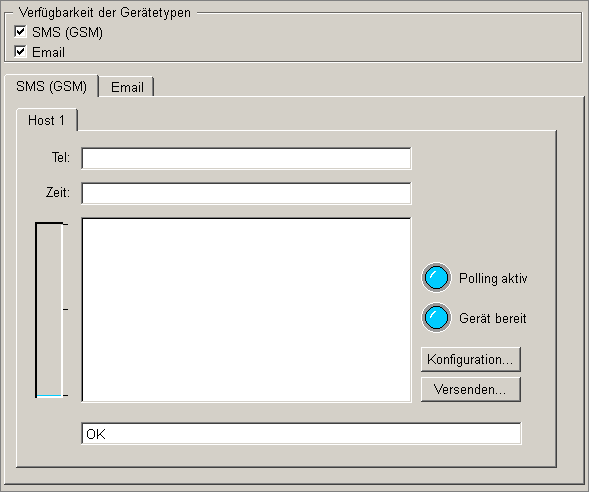 SMS (GSM) - Beim Verschicken längerer Alarmtexten (Länge ist beschränkt auf 128 Zeichen) mit dem Communication Center, wird die Nachricht auf mehrere SMSen aufgeteilt. Die Parameter-Einstellungen zum Verschicken/Empfangen von SMS wird durch Klick auf die Schaltfläche Konfiguration... vorgenommen: