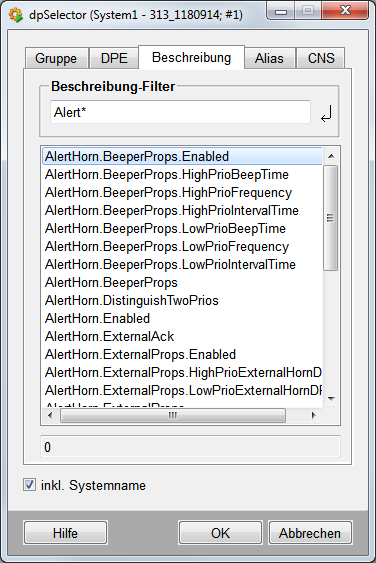 Geben Sie eine DPE-Beschreibung bzw. die Bezeichnung mit Wildcards an. Z.B. Alert* zeigt alle Datenpunktelemente mit einer DPE-Beschreibung, die mit Alert beginnt. Die Anzeige erfolgt alphabetisch geordnet.