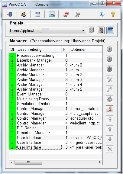 Bei der Console handelt es sich um das Verwaltungszentrum der einzelnen WinCC OA Komponenten. Von hier aus werden weitere Funktionalitäten gestartet oder gestoppt. In der nun geöffneten Oberfläche muss in der Combobox "Projekt" der Eintrag "DemoApplication_<Version>" ausgewählt sein. Die Liste darunter zeigt die in der Applikation notwendigen Teilkomponenten (siehe auch WinCC OA Manager). Die Nummern für die verschiedenen Manager werden in der WinCC OA Console automatisch vergeben. Die Liste in der Console sollte etwa folgendermaßen aussehen: