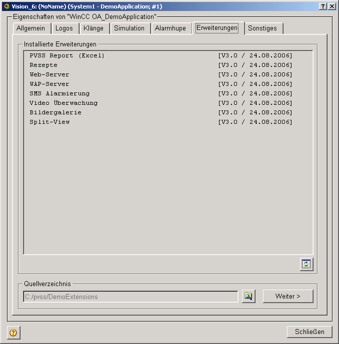 Mit der Standard DVD von WinCC OA und der darauf enthaltenen DemoApplication, werden keine Erweiterungspakete mitgeliefert! Dadurch enthält die Registerkarte defaultmäßig auch keine Einträge und Einträge erst nach der Installation von Erweiterungen sichtbar sind. Bezüglich des Erweiterungspakets kontaktieren Sie das ETM-PoduktCenter.