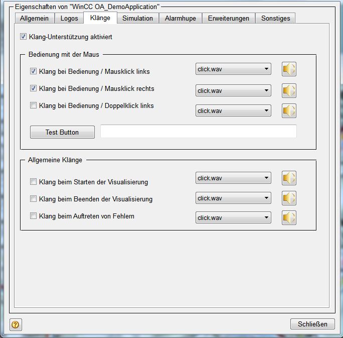 In WinCC OA können die verschieden Formen der Mausbedienung, also Klick links, rechts und Doppelklick mit einem akustischen Signal verknüpft werden. Dies kann vor allem für in der Mausbedienung unerfahrene Anwender hilfreich sein, welche so sofort die Rückmeldung haben, ob sie eine Bedienhandlung initiiert haben.
