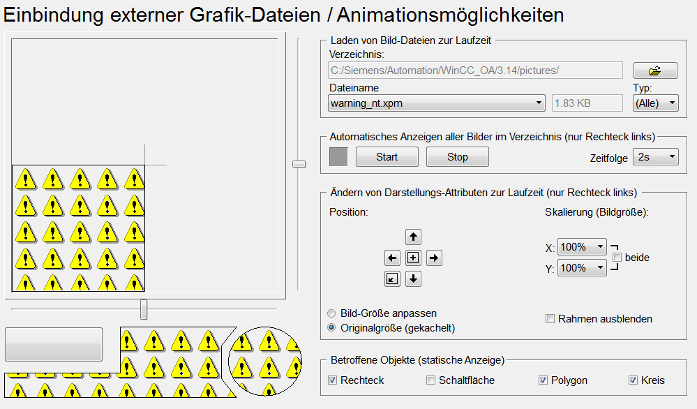 Alle Grafikdateien in einem Verzeichnis (bzw. bei Typvorgabe eine Untermenge davon) können in diesem Demonstrationspanel als Bildfolge angezeigt werden. Überdies ist es möglich, für das Rechteck in der linken Bildhälfte die Skalierung, Größenanpassung und Position auch zur Laufzeit dynamisch zu verändern.