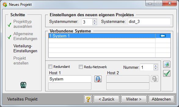 System 1 ist der Server zu dem alle anderen Systeme als Clients verbunden sind. System 1 wird daher als erstes Projekt angelegt und erfordert keine weiteren Einstellungen.