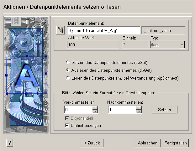 Mit dieser Funktion wird der Wert des angegebenen Datenpunktes ausgelesen und auf das Grafikobjekt geschrieben. Wird ein Text-Wert ausgelesen, kann eine Formatierung (Anzahl von Zeichen ) angegeben werden. Bei Zahlen kann die Anzahl von Vor- und Nachkommastellen bestimmt werden. Das Auslesen ist nur bei einfachen Texten und Textfeldern möglich.