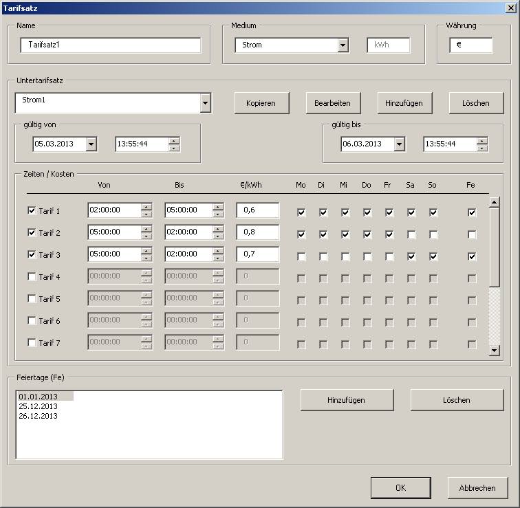 Tarife inklusive deren Tarifsatzes mit Kostenstelle und Gültigkeit (HT / NT, ..)