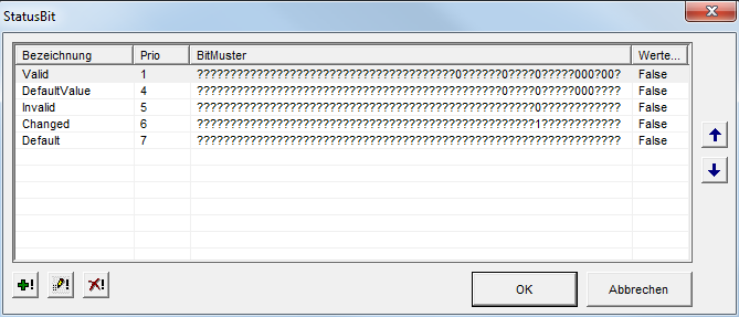 Eine Liste der definierten Statusbits und deren Bedeutung ist in der Abbildung dargestellt. Bei der Auswertung der Daten wird die Liste der Bitmuster von oben nach unten bis zur ersten Fundstelle durchsucht. Diese Formatierung wird dann auf die Zelle angewendet. Sinnvollerweise sollen häufig zu erwartende Bitmuster (z.B. "gültig") möglichst oben in der Liste stehen.