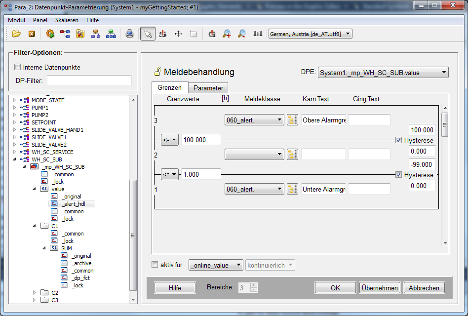 Bei analogen Meldebehandlungen können für jeden Meldebereich Hysteresen angegeben werden, damit bei ständigem, geringfügigem Über- bzw. Unterschreiten von Grenzwerten nicht permanent neue Alarme ausgelöst werden. Jedem Meldebereich wird zudem eine ganze Reihe von Eigenschaften zugewiesen. Dazu Zählen beispielsweise: