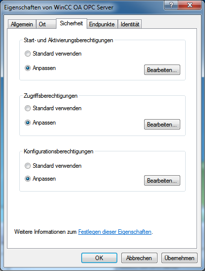 Wählen Sie in der Registerkarte"Sicherheit" > "Benutzerdefinierte Zugriffsberechtigungen verwenden" und vergewissern Sie sich im DialogBearbeiten, dass der Benutzer des Rechners auf dem der OPC Client läuft (zugreifender Rechner), mit den Rechten "Zugriff erlauben" ausgestattet ist. Dieser Benutzer kann auch Mitglied einer Gruppe sein, für welche diese Rechte gegeben sind.