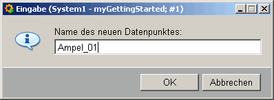 Nachdem Sie alle Parameter am Master-Datenpunkt eingestellt haben, erfolgt das Anlegen eines DPs im Modul PARA. Klicken Sie mit der rechten Maustaste auf den DPT Ampel und wählen Datenpunkt erstellen. Geben Sie den Namen des Datenpunktes (z.B. "Ampel_01") im erscheinenden Dialogfenster an und klicken Sie OK.
