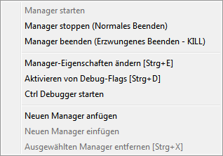 Die durch die Schaltflächen verfügbaren Funktionen, können auch über ein Kontextmenü in der Console erreicht werden. Klicken Sie mit der rechten Maustaste auf einen beliebigen Manager, um Einstellungen einzelner Manager über dieses Kontextmenü durchzuführen. Weiters stehen Hotkeys (Tastaturkürzel) zur Verfügung, die ein Öffnen der einzelnen Panels für die Managerverwaltung erlauben (z.B. Strg-L für Console sperren, Strg-D für Aktivieren von Debug-Flags, usw.). Diese Tastaturkürzel sind im Tooltip der einzelnen Schaltflächen, im Kontextmenü und in der Titelleiste des jeweiligen Panels ersichtlich.