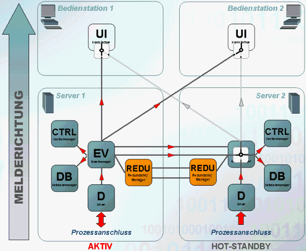 Die UIs beider Bedienstationen sind im Redundanzfall mit beiden Event-Managern verbunden, es werden jedoch nur die Daten des aktiven Systems auf beiden UIs dargestellt.