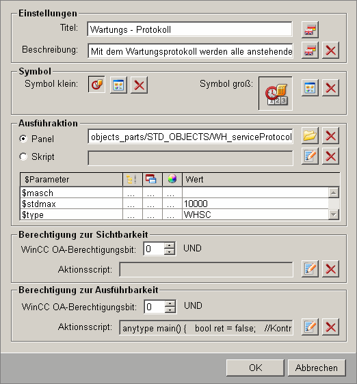 Im Bereich "Berechtigung zur Ausführbarkeit" wird das WinCC OA Berechtigungsbit definiert, für welches das Item im System Management Panel und GEDI Menü ausführbar sein soll (siehe auch Berechtigungsstufen und Config "Berechtigung"). Zusätzlich kann für die Ausführbarkeit ein Aktionsskript hinterlegt werden.