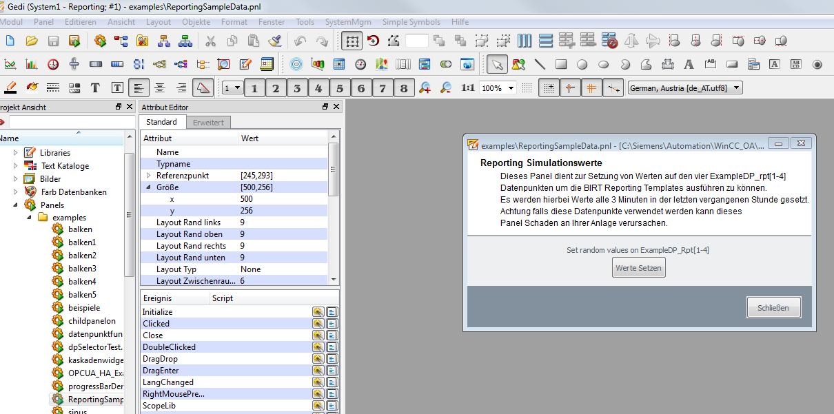 Es gibt ein Panel um Simulationswerte für die Reporting-Datenpunkte zu setzen. Die Reporting-Datenpunkte sind Datenpunkte, die für die Reporting-Templates verwendet werden. Die Reporting-Templates werden mit der WinCC_OA-Installation mitgeliefert. Die Templates liegen unter WinCC_OA_Pfad/data/Reporting/Templates/BIRT. Das Panel für die Simulationswerte "ReportingSampleData.pnl" wird mit der WinCC_OA-Installation mitgeliefert und liegt unter WinCC_OA_Pfad/panels/examples.
