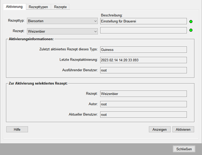 - Aktivierungsinformationen: Darin sind alle Informationen ersichtlich, die bei der Aktivierung eines Rezepts gespeichert werden. Wurde zu dem zuvor gewählten Typ kein Rezept aktiviert so bleiben diese 3 Felder leer.