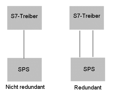 In der normalen Konfiguration (weder redundante SPS noch redundante Verbindung, siehe die erste Abbildung unterhalb) baut der S7-Treiber zwei Lese- und eine Schreibverbindung zu der SPS.