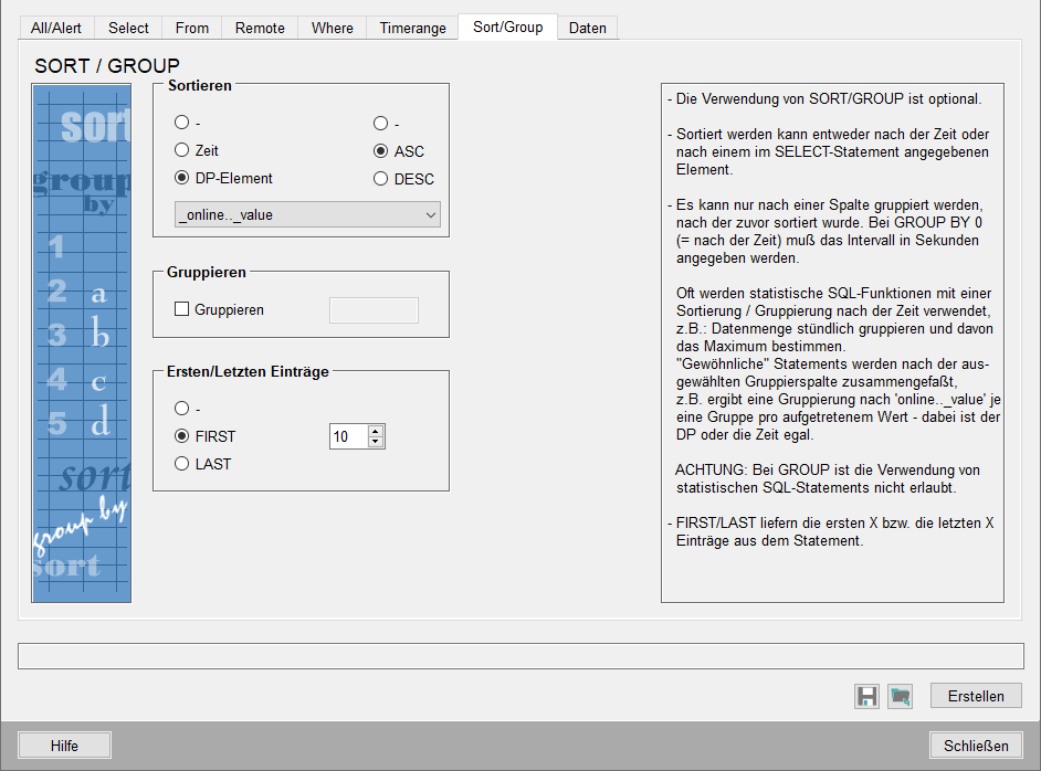 Mit Sort/Group kann eine Sortierung bzw. Gruppierung für die Abfrage eingestellt werden.