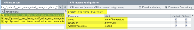 Die KPI Instanz wird für alle ssc_demo_drive-Datenpunkte (1,2 und 3) konfiguriert, da das Fragezeichen für den Kontext verwendet wurde (siehe oberhalb).