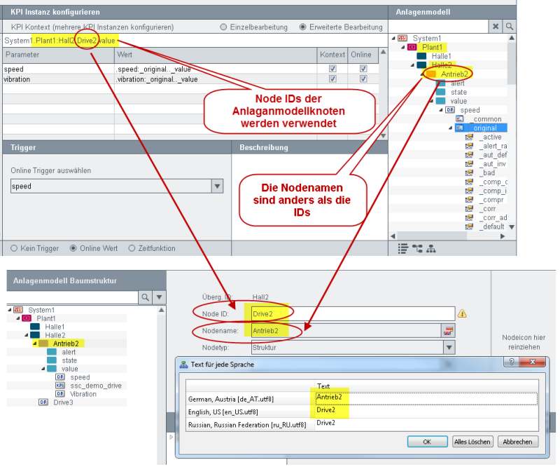 Beachten Sie, dass wenn Sie Anlagenmodellpfade für die KPI-Kontextsuche verwenden, es zu Unterschieden zwischen KPI-Kontext und Anlagenmodellbaum kommen kann, wenn der Knotenname (Nodename) anders als die Node ID ist. Siehe Abbildung unterhalb:
