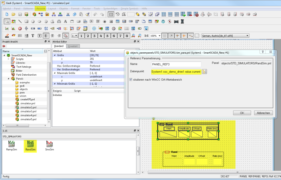 Scrollen Sie nach unten zu den STD_SIMULATORS-Symbolen und fügen Sie das Objekt "RandSim" über Drag&Drop zu Ihrem Panel hinzu. Das Panel der Datenpunktselektion wird automatisch geöffnet. Klicken Sie auf die PARA-Schaltfläche und selektieren Sie das Datenpunktelement "ssc_demo_drive1.value.current".