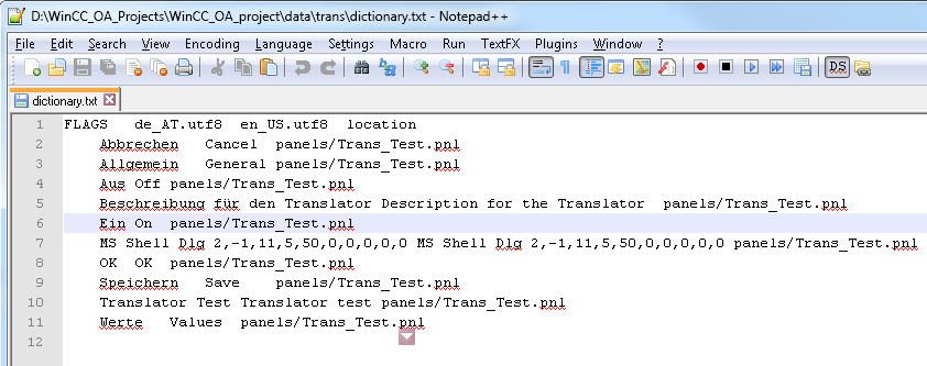 Das Projektpanel konnte mit wenigen Schritten leicht ins Englische übersetzt werden. Öffnen Sie das Panel im Modul VISION mit der Sprachoption "en_US.utf8" ---> -extend -lang "en_US.utf8" -p para/Trans_Test.pnl. Das unten dargestellte Panel wird angezeigt.