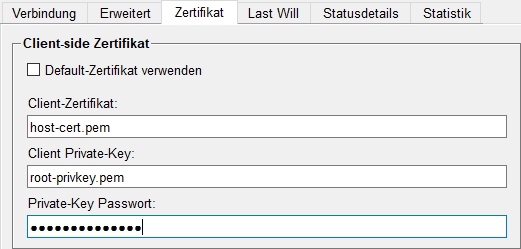 Dieser Tab erlaubt es das Client-side Zertifikat zu definieren, welches für die Kommunkation mit dem Broker verwendet werden soll. Für einen TLS-Verbindungstyp können MQTT-Broker so konfiguriert werden, dass sie die Client-Identität überprüfen, indem sie prüfen, ob das Client-Zertifikat vertrauenswürdig ist. Dazu muss ein Client-Zertifikat konfiguriert werden und das entsprechende Root-Zertifikat oder das Client-Anwendungszertifikat muss sich in der Zertifikatsvertrauensliste des Brokers befinden. Wie dies geschieht, hängt vom Broker ab - siehe die spezifische Broker-Dokumentation.