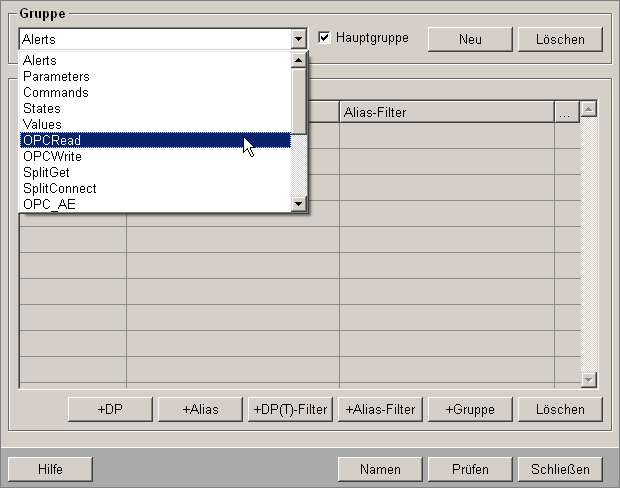Beachten Sie, dass OPCRead- und OPCWrite-Gruppen nicht gelöscht werden dürfen. Falls Sie jedoch die Gruppen löschen, müssen Sie einen Alias für die gelöschte Gruppe(n) anlegen da ansonsten der OPC-Server der Gruppe nicht erkannt wird.