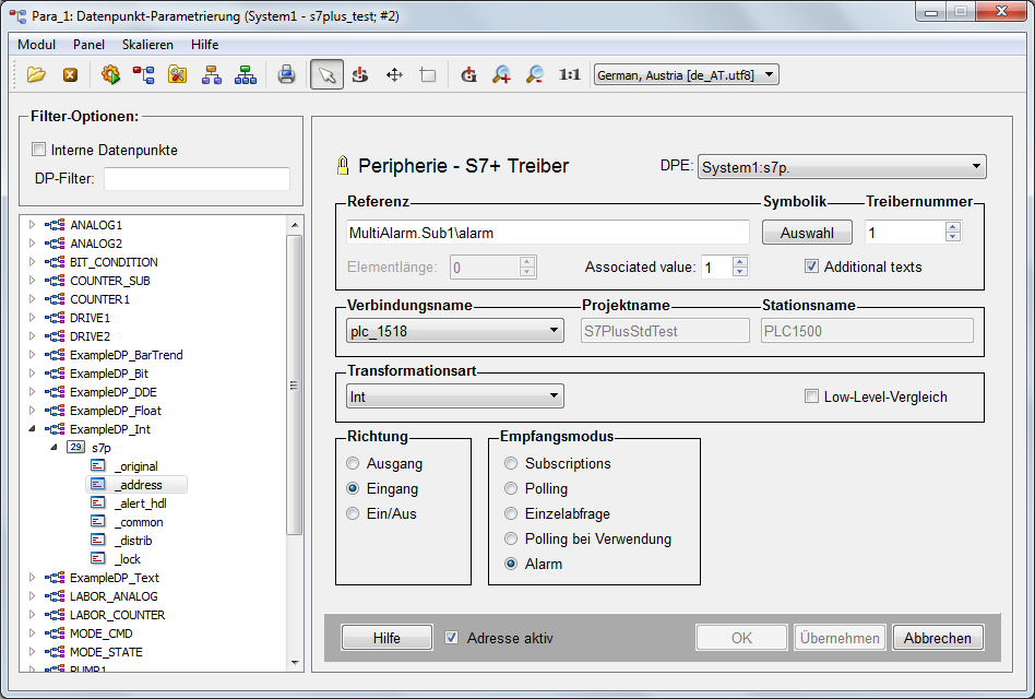 Die Alarmbehandlung (_alert_hdl) erfolgt über Multiinstanzalarme (siehe Meldebehandlung für Multiinstanzalarme) und muss am entsprechenden DPE angelegt werden. Multiinstanzalarme sind nicht vom Originalwert des Datenpunktelementes abhängig, sondern reagieren auf die Werte, die von der SPS empfangen werden. Alarmeigenschaften (wie z.B. Alarmklasse oder Alarmtext) werden beim Auslösen des Alarms dynamisch vom Treiber geändert.