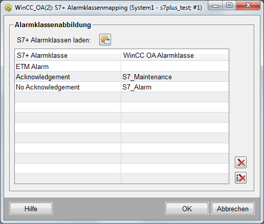 Klicken Sie im Systemmanagementpanel auf die Schaltlfäche "S7+ Alarm Class Mapping" um die TIA Portal Alarmklassen auf WinCC OA Alarmklassen abzubilden. Ohne diese Zurodnung wird für neue Alarme direkt die Alarmklasse vom jeweiligen _alert_hdl-Config herangezogen.