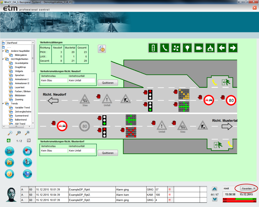 Sie können auch unterschiedliche Favoriten für mehrere Monitore definieren. Die Nummer des Monitors wird neben dem Bildschirmnamen angezeigt. Wenn Sie unterschiedliche Favoriten für z.B. zwei Monitore definieren wollen, öffnen Sie die verschiedenen Panels und speichern Sie den Favorit. Es werden zwei Panels gespeichert (z.B. Bildschirm 1 = Anlg_1 und Bildschirm 2 = Anlage2).