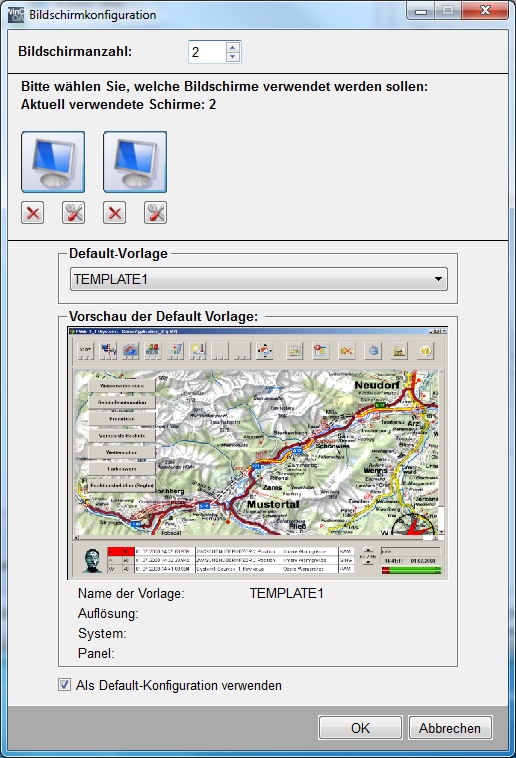 Default Vorlage - wählen Sie hier eine Default-Vorlage, die für alle aktivierten Bildschirme gültig wird. Achtung: einzelne Bildschirmparametrierungen werden dabei überschrieben! Die Vorlage wird automatisch an die Auflösung angepasst. Welche Vorlagen ausgewählt werden können und welche Auflösungen die verfügbaren Vorlagen besitzen, wird im Kapitel Panelvorlage wählen beschrieben.