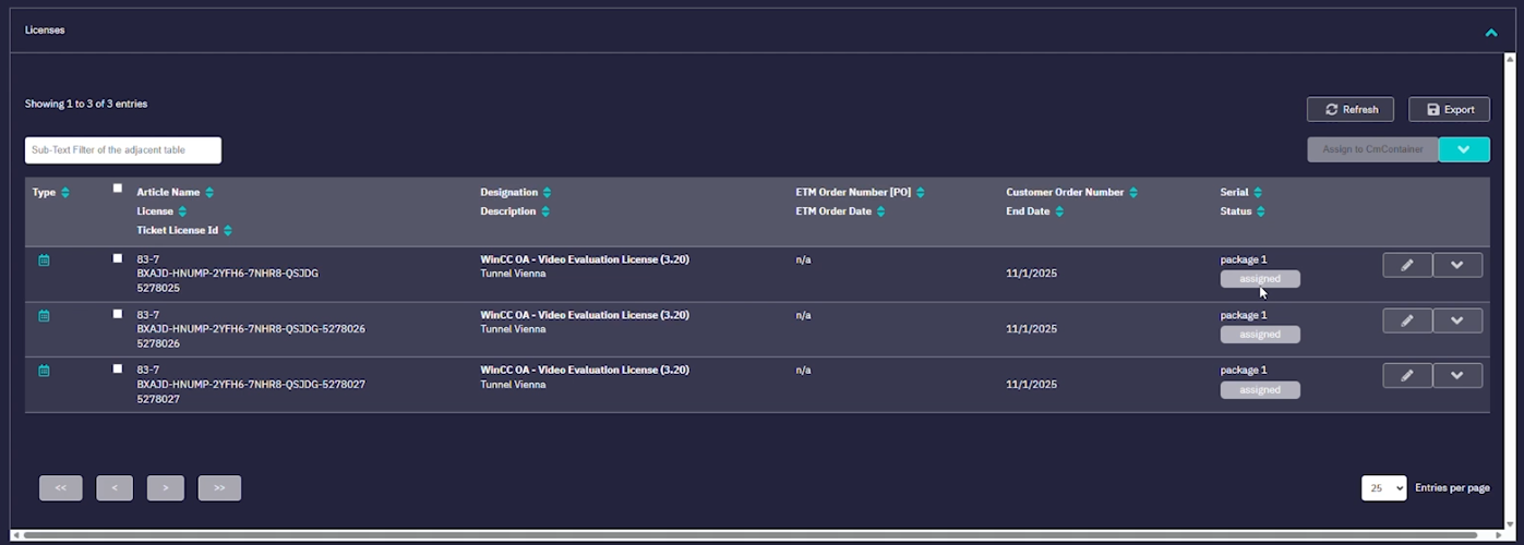 Das Zuweisen von Lizenzen zu einem virtuellen Container im WinCC OA Lizenzportal ermöglicht das Vorverpacken von Lizenzoptionen für die Remote-Bereitstellung. Dieser Prozess vereinfacht die Lizenzvorbereitung für Außendiensttechniker oder Servicepersonal und sorgt für eine effiziente und organisierte Verteilung.