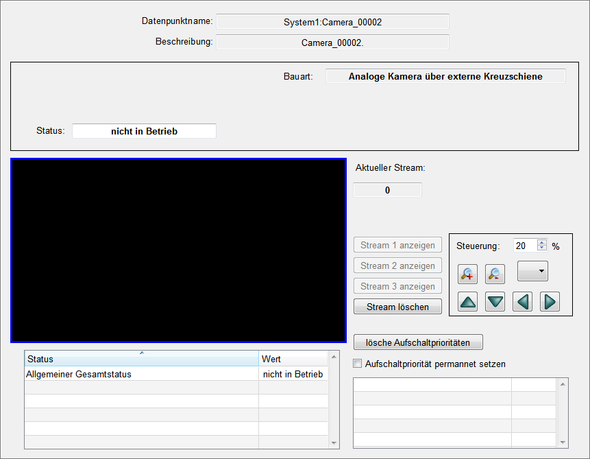 Über einen Linksklick im Video Objekt Explorer auf eine Kamera wird ein Panel mit Informationen zu Typ, Konfiguration und Status der Kamera aufgeschaltet.