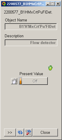 The state of Present_Value that is shown in the faceplate has the following meaning: green = ACTIVE (1) and gray = INACTIVE (0). When the hand mode is activated, the present state can be changed directly in the faceplate. For more details, see Value Input Panel.