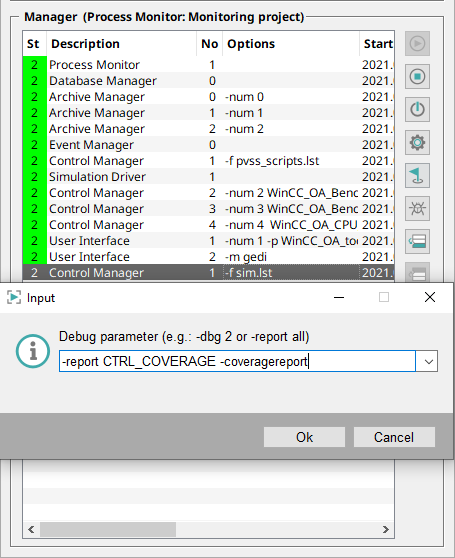 When -dbg CTRL_COVERAGE or -dbg CTRL_PERF is active on Manager start, an output file is created and will continuously be filled when data needs to be written (e.g. a thread ends or a script is stopped or when the manager finishes). For more information, see CTRL Coverage Output. |