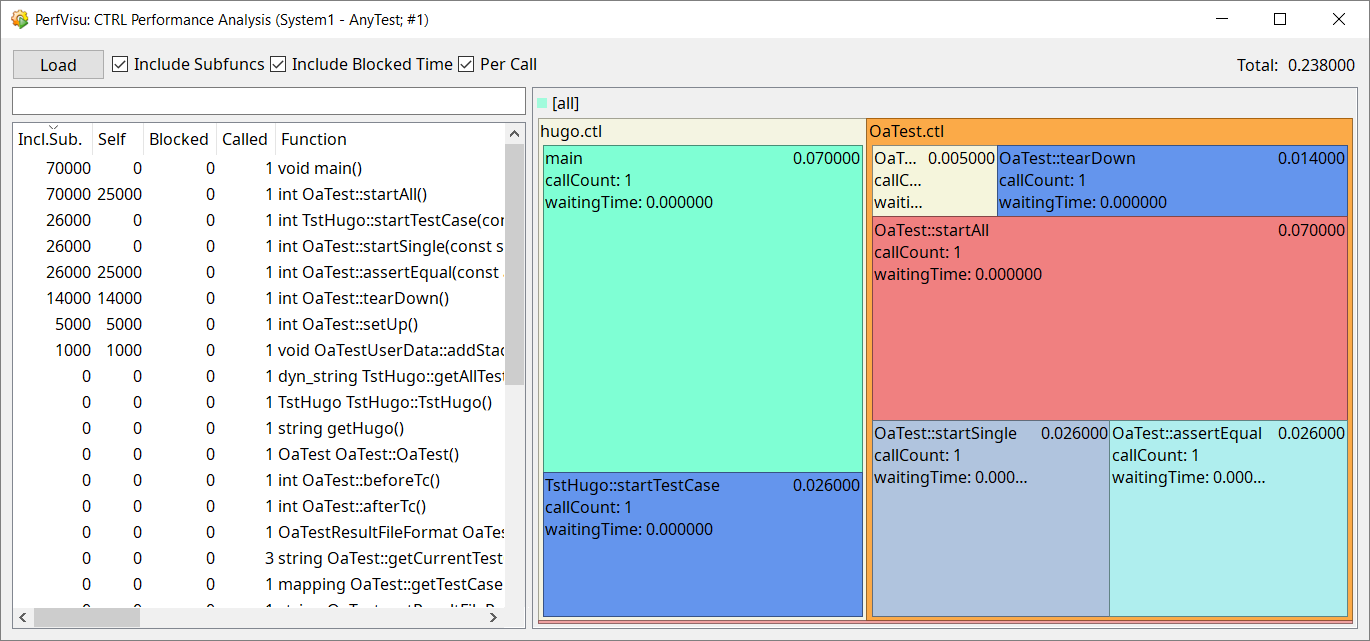 The Coverage or Performance Report is opened in the PerfVisu panel. The display can be filtered with the option- check boxes at the top.