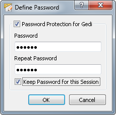 - The window "Define Password" is opened. Enable the check box "Password Protection for Gedi" and enter a password. Check the check box "Keep password for this Session". Then click onOK. Since you checked the check box, the window is not shown when editing the script within the current session and the script is opened without showing a note.
