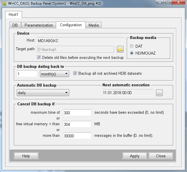 - Abort backup if free memory is less than x [MB]. The minimum value is 50 [MB] over the limit with which the Data Manager would go into emergency mode, usually 60 [MB]. If memory is insufficient, an error message is issued.
