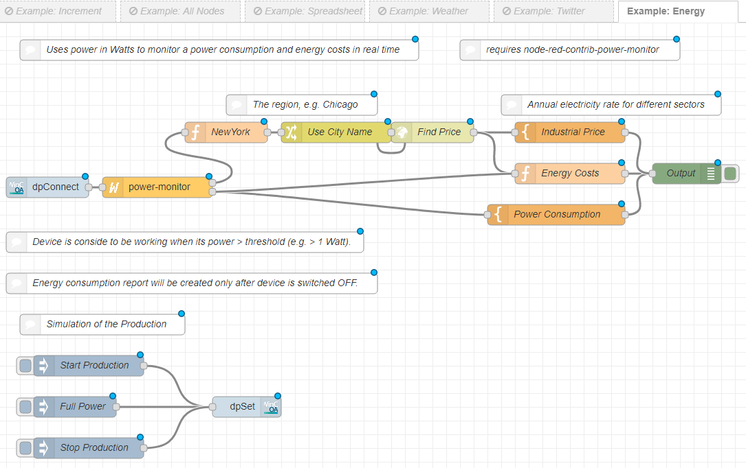 This example simulates a production line and monitors its power consumption as well as the resulting energy costs. The Node-RED node "power monitor" is used. This node is included in the "node-red-contrib-power-monitor", which has to be installed (e.g.: in the palette section of the Editor with "Manage Palette").