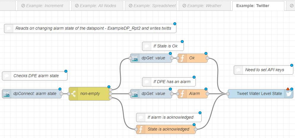WinCC OA provides 7 Example Flows that showcase the use of the WinCC OA Nodes: