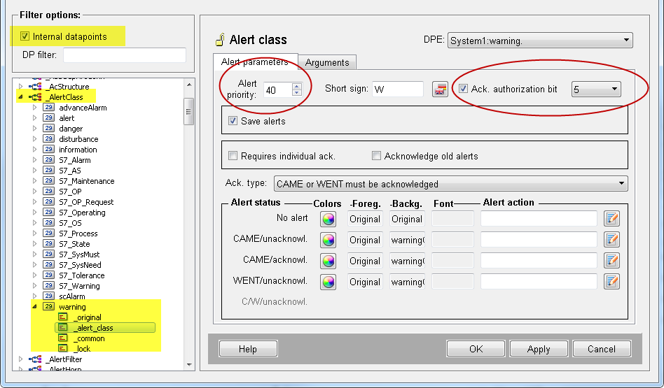 The alert class "warning" with the alert priority 40 was used for the alert handling of the data point "ExampleDP_arg2" when the alert class 040_warning was selected. Therefore, the acknowledgement authorization of the internal alert class is valid for the data point "ExampleDP_arg2".