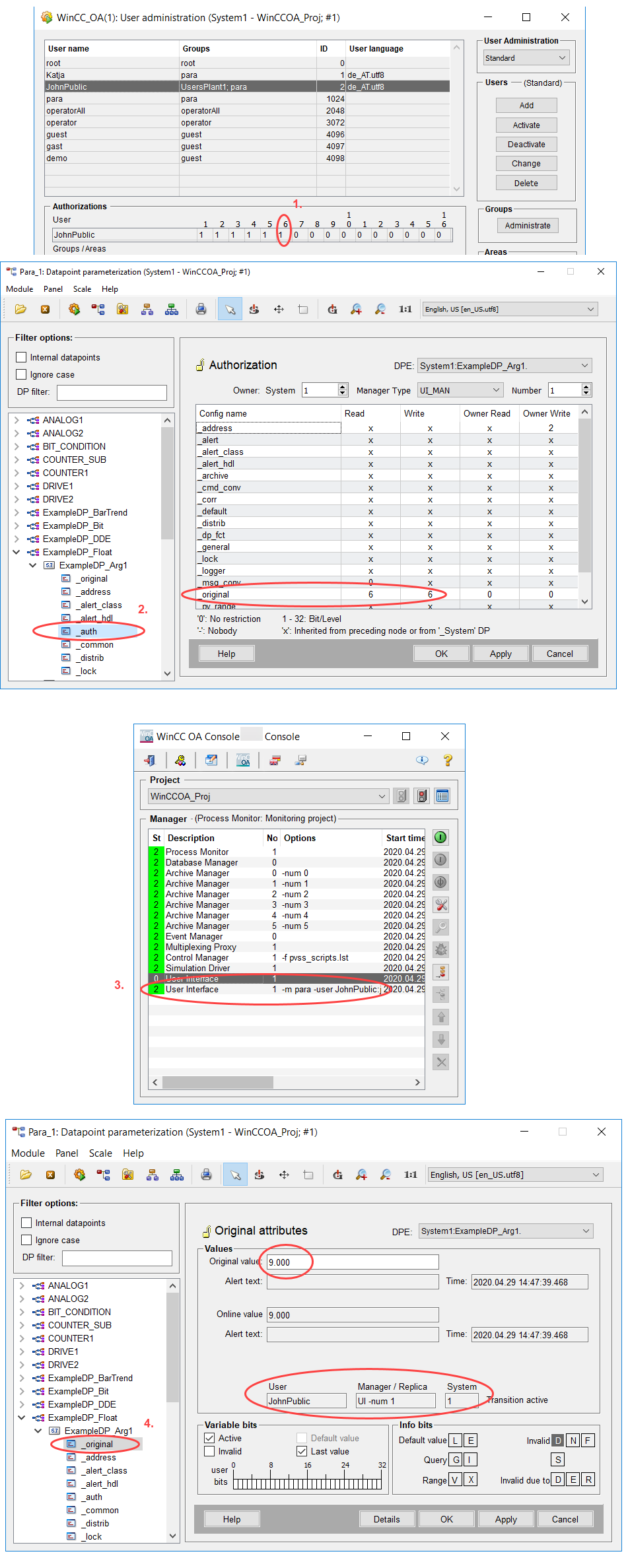In this example, the bit 6 for "Write" was set for the UI Manager with the number 1. This means that a UI Manager with the number 1 running under a user who possesses the bit 6, may change the original value of the data point ExampleDP_Arg1.