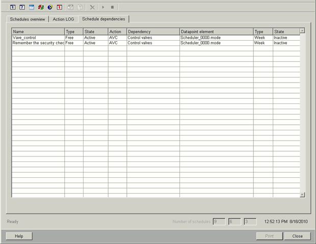 Additionally in the column Description schedules description text can be replaced by the schedules data point name. The actions and all the information required by the scheduler are saved in scheduler specific data points (for more information on the scheduler data points, see chapter Scheduler details). Thus the schedule can be identified within the data point framework at any time.