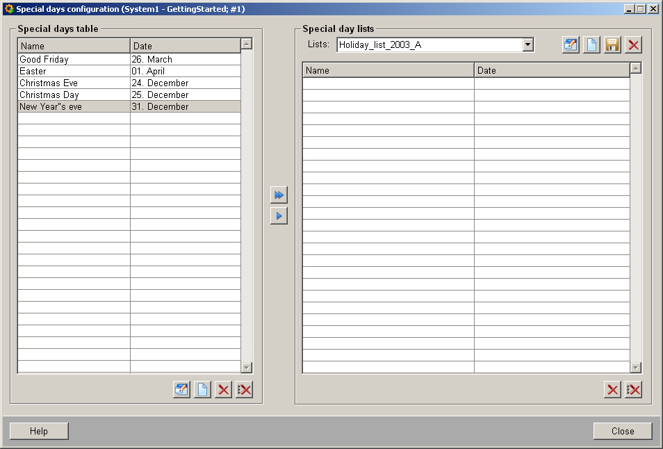 A special day list Holiday_list_2003_A was easily created and can be used when creating schedules.