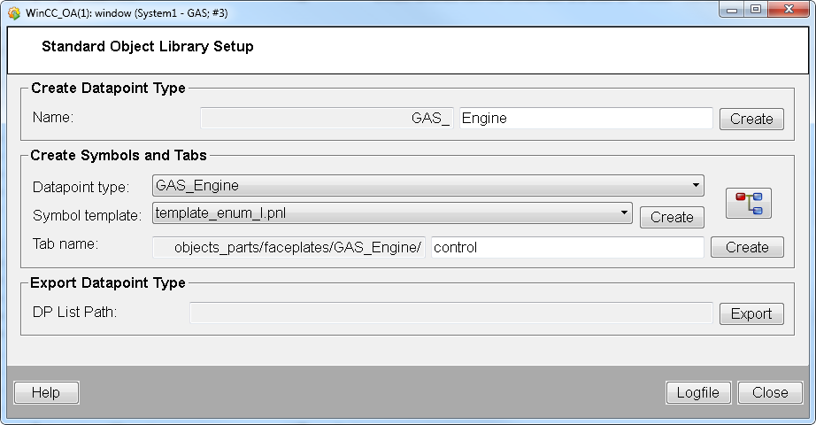 e.g. GAS_Engine - see below. When you use the Standard Object Library Setup panel to create a data point type, the prefix and the necessary nodes are automatically added to the data point type. NOTE, however, that you must add the elements (such as "engineState" - see below) to the nodes according to your requirements.