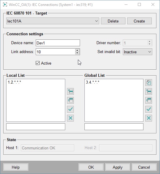 Click on Create to create a new data point of the _IecConnection data point type. (incl. redundant DP). Valid characters for a connection data point are [a-z,A-Z,0-9,_]. In a redundant WinCC OA project a data point with the name "<datapointName>_2" is created automatically.